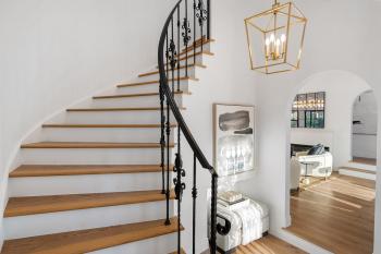 A striking statement light fixture sets the tone in the entryway, leading into a spacious living room bathed in natural light from large picture windows. The open layout connects effortlessly to the chef’s kitchen, beautifully appointed with a central island, Thermador appliances, Zephyr hood, wine fridge, and integrated Thermador refrigerator and dishwasher — the ideal culinary setting for both daily cooking and elevated entertaining.