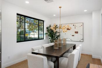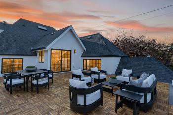 Just beyond, the dining room features another sculptural light fixture and a private rooftop terrace expands the living space outdoors for al fresco dining, lounging, and gatherings under the Burlingame sky.